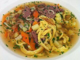Während die Brühe köchelt, können Kartoffeln, Spätzle und angeschwitzte Zwiebeln zubereitet werden. Weder Spätzle noch Kartoffeln werden in der Brühe gekocht, sondern separat zubereitet.